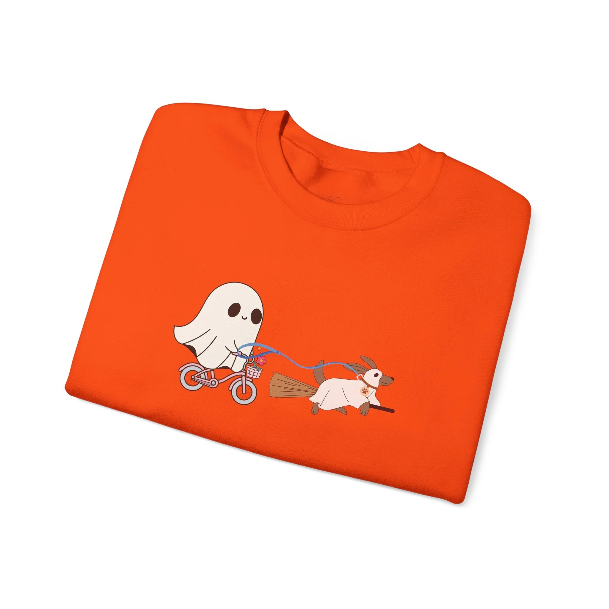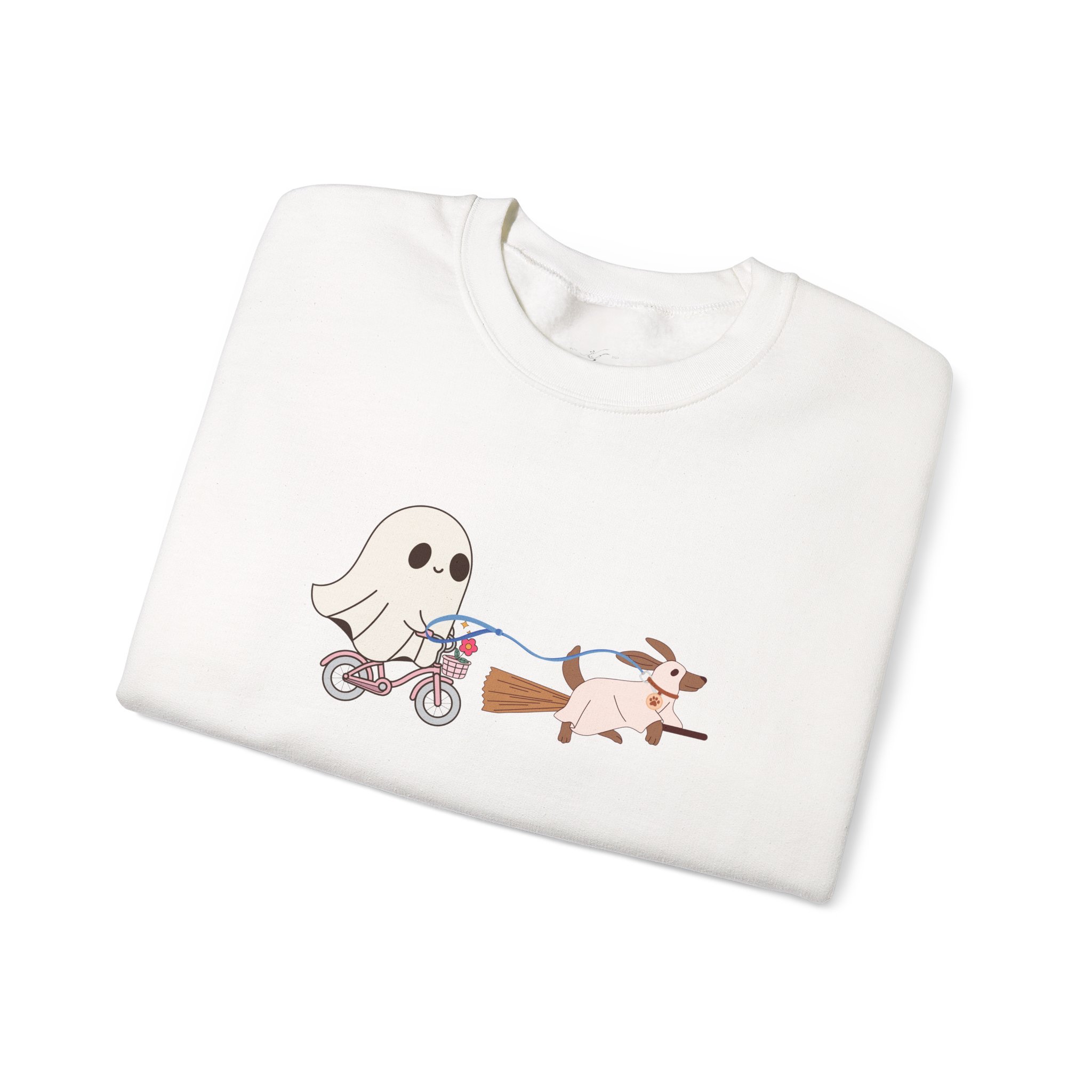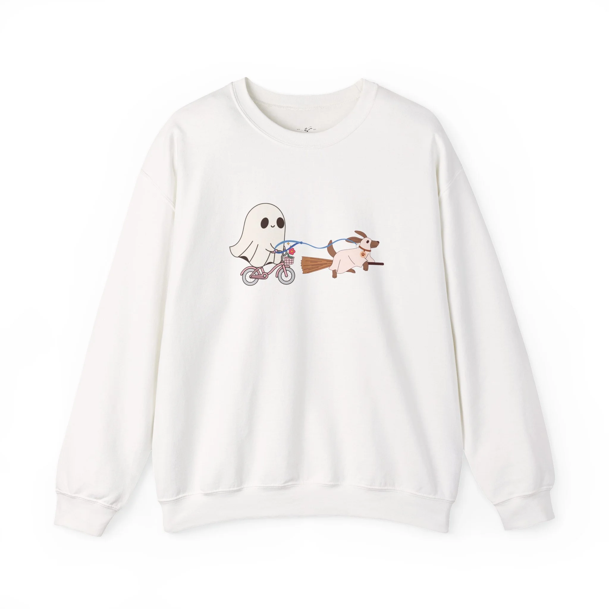 A cozy Unisex Heavy Blend™ Crewneck Sweatshirt featuring a cute design of a dog being walked by a ghost, perfect for Halloween enthusiasts. This sweatshirt is built for comfort and durability, with a classic fit and double-needle stitching for top-tier quality. It is ideal for adults looking to stay warm and stylish during the Halloween season.