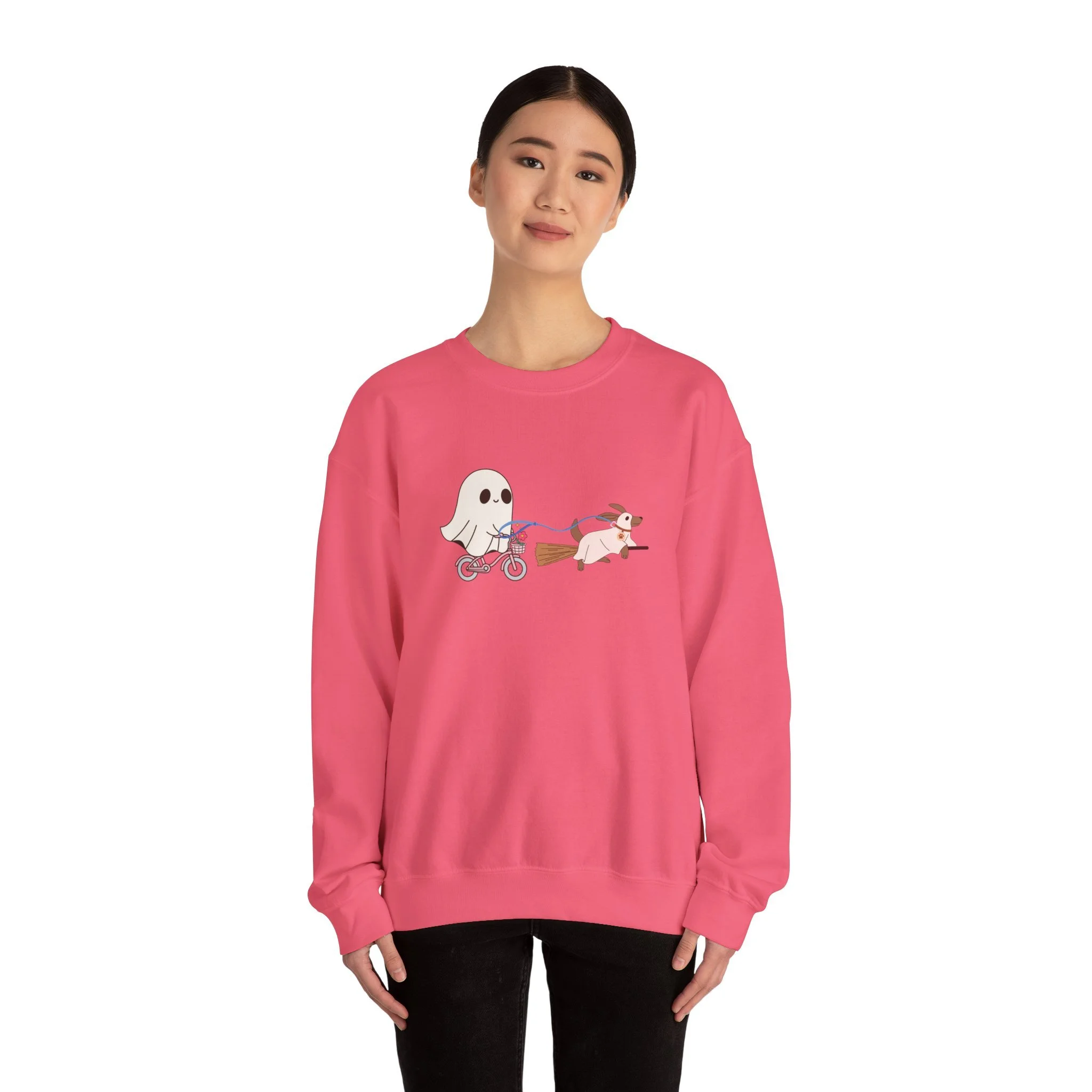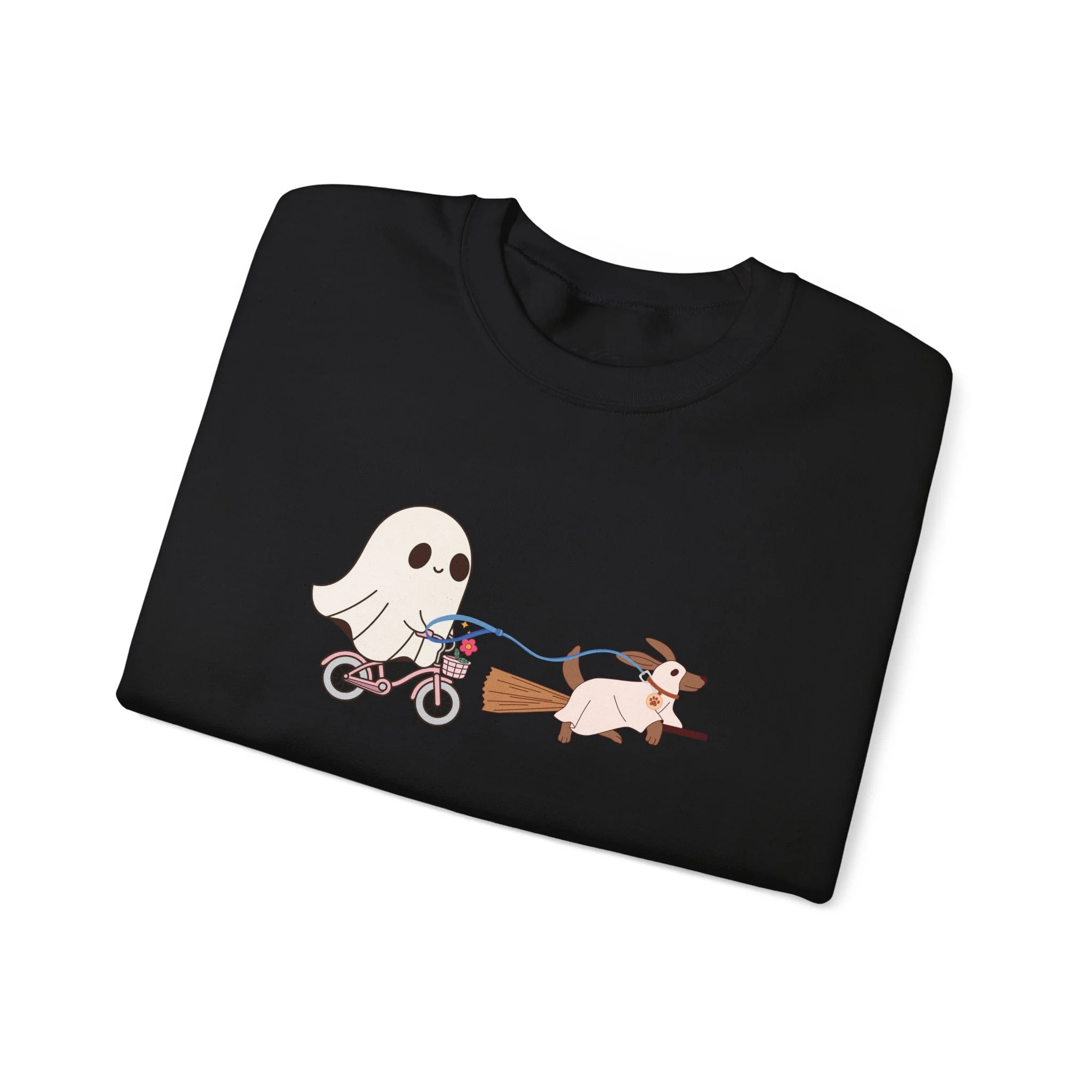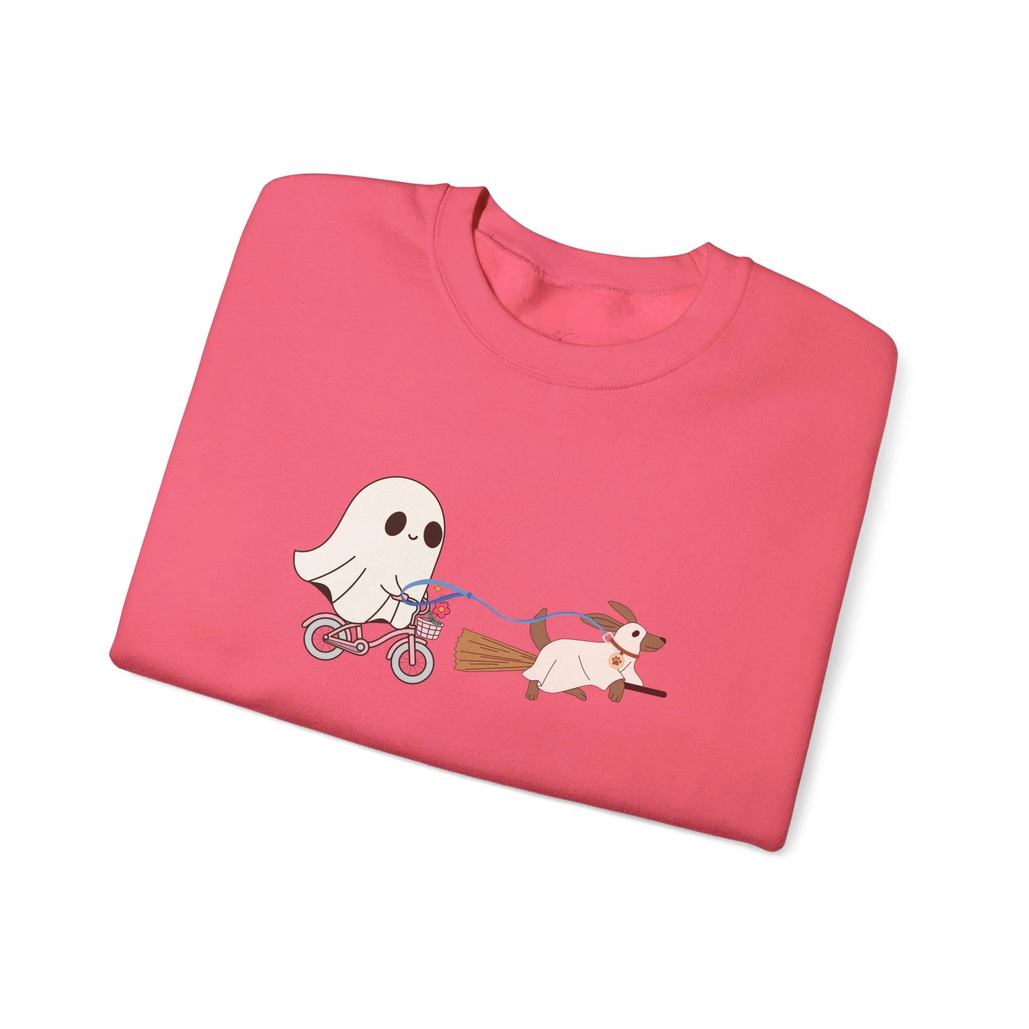 A cozy Unisex Heavy Blend™ Crewneck Sweatshirt featuring a cute design of a dog being walked by a ghost, perfect for Halloween enthusiasts. This sweatshirt is built for comfort and durability, with a classic fit and double-needle stitching for top-tier quality. It is ideal for adults looking to stay warm and stylish during the Halloween season.